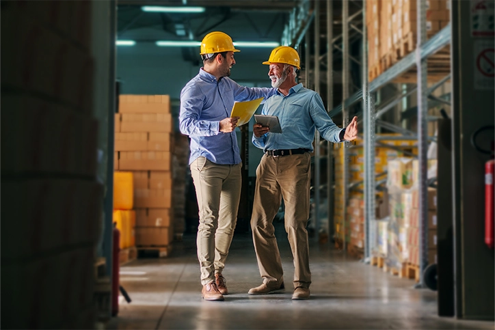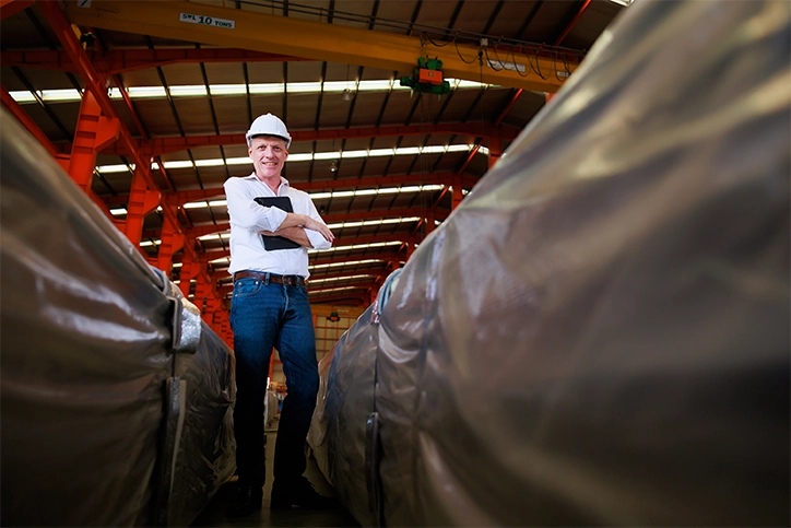 A smiling male business owner looks up at the shelves in his warehouse whilst thinking about his competitive commercial energy prices